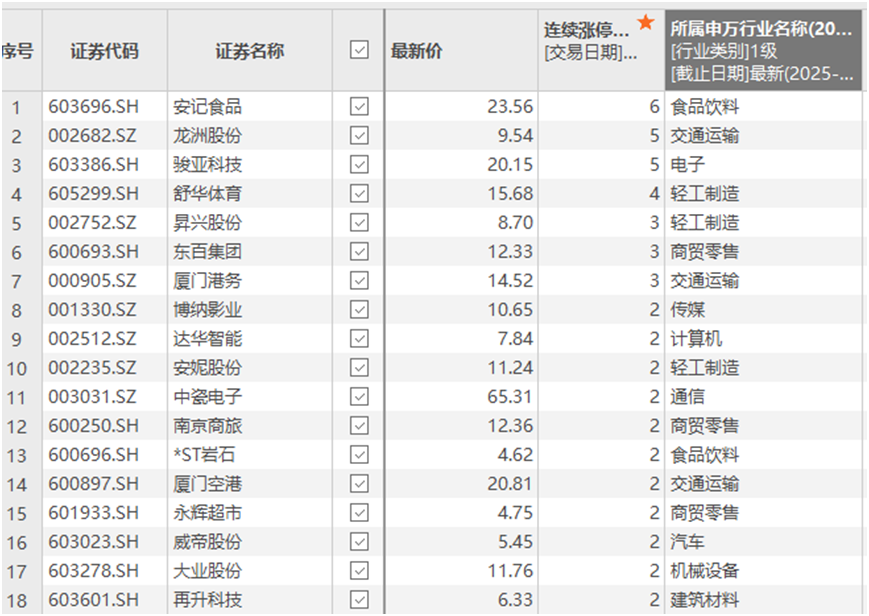 连续涨停天数看免费杠杆配资门户网,安记食品已连收6个涨停板,连续涨停板数量最多。龙洲股份、骏亚电子5连板,舒华体育4连板,厦门港务、东百集团等3连板,安妮股份等2连板。