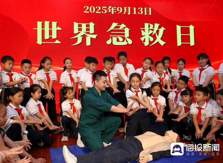 《急救知识进校园》2025年9月12日,医务人员在山东省枣庄市市中区光明路小学指导学生学习心肺复苏急救技能。第26个“世界急救日”来临之际,当地组织学生们学习日常救护知识,提高他们的自救互救意识和能力。孙中喆 李亮 摄