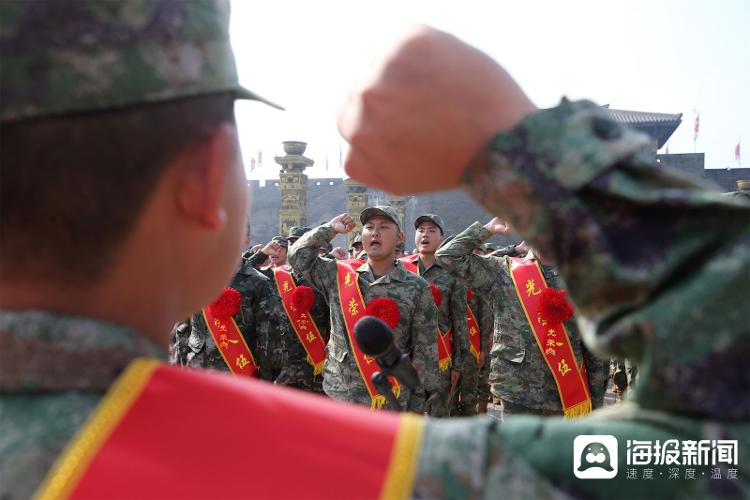 《欢送新兵入伍》2025年9月14日,山东省临沂市郯城县入伍新兵进行集体宣誓。当日,郯城县即将入伍的125名新兵身着崭新军装,精神抖擞,肩负着家乡人民的殷切期望,准备奔赴军营建功立业。李结义 摄