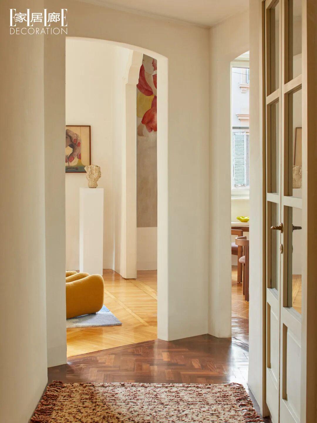 公寓大楼以内庭院为中心而建的住宅建筑,楼内公共区域内有着别具一格的雕花瓷砖、彩色玻璃以及老式电梯,是颇具米兰特色的一种建筑类型“Casa di Ringhiera”。房子本身的硬装条件几乎完好如初,只需要一一放置软装部分。虽说在意大利更容易找到心仪的设计类家具,但国外低效的物流及沟通方式,让采买家具变成了“痛并快乐”的过程。