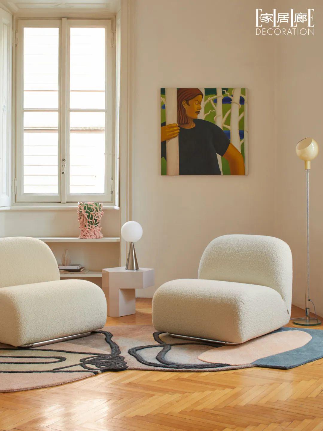 白色的单人椅Due Più出自意大利家具品牌Arcebis,这件意大利设计史上标志性的作品由意大利女性建筑师Nanda Vigo在上世纪70年代设计,两个漂浮的皮毛滚轮作为坐垫与靠背,再由金属直角钢管连接,设计大胆先锋。