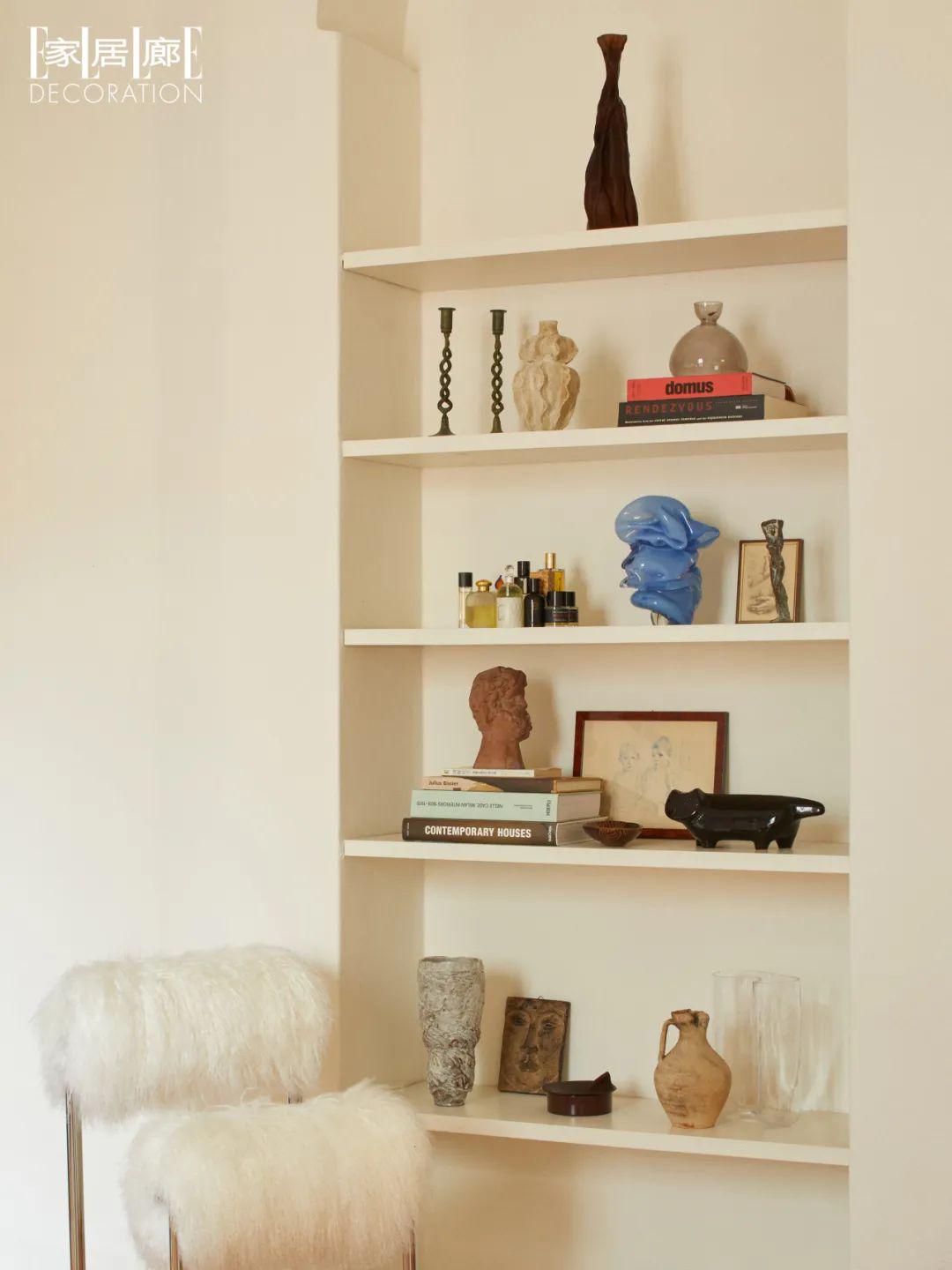 置物架上摆放了思嘉在米兰各个中古市场及画廊淘寻的花瓶、雕塑、烛台,随手可以找寻灵感的意大利设计杂志,还有她多年累积的沙龙香水,顶部3D打印花瓶格外吸睛,来自Las Project。