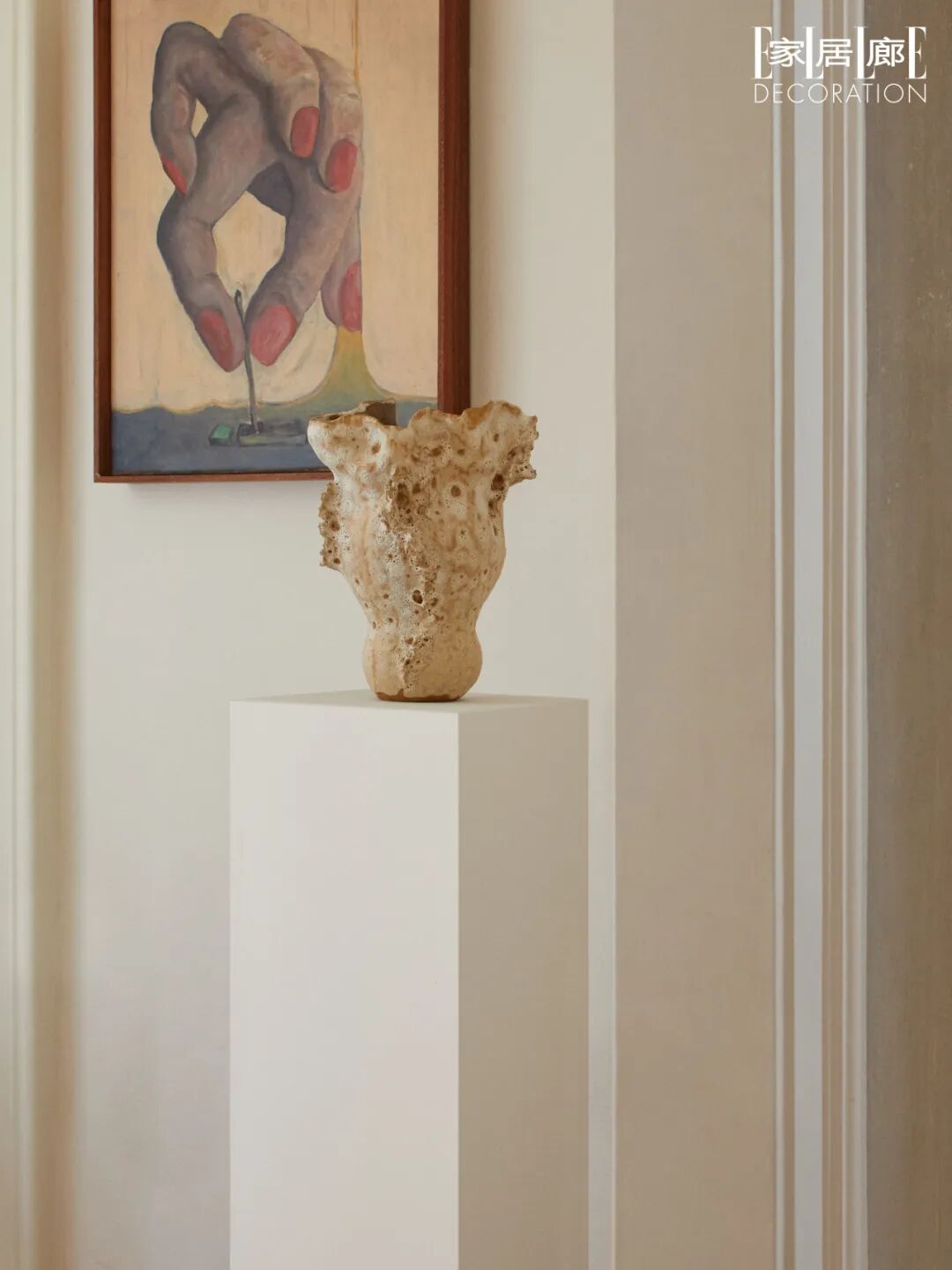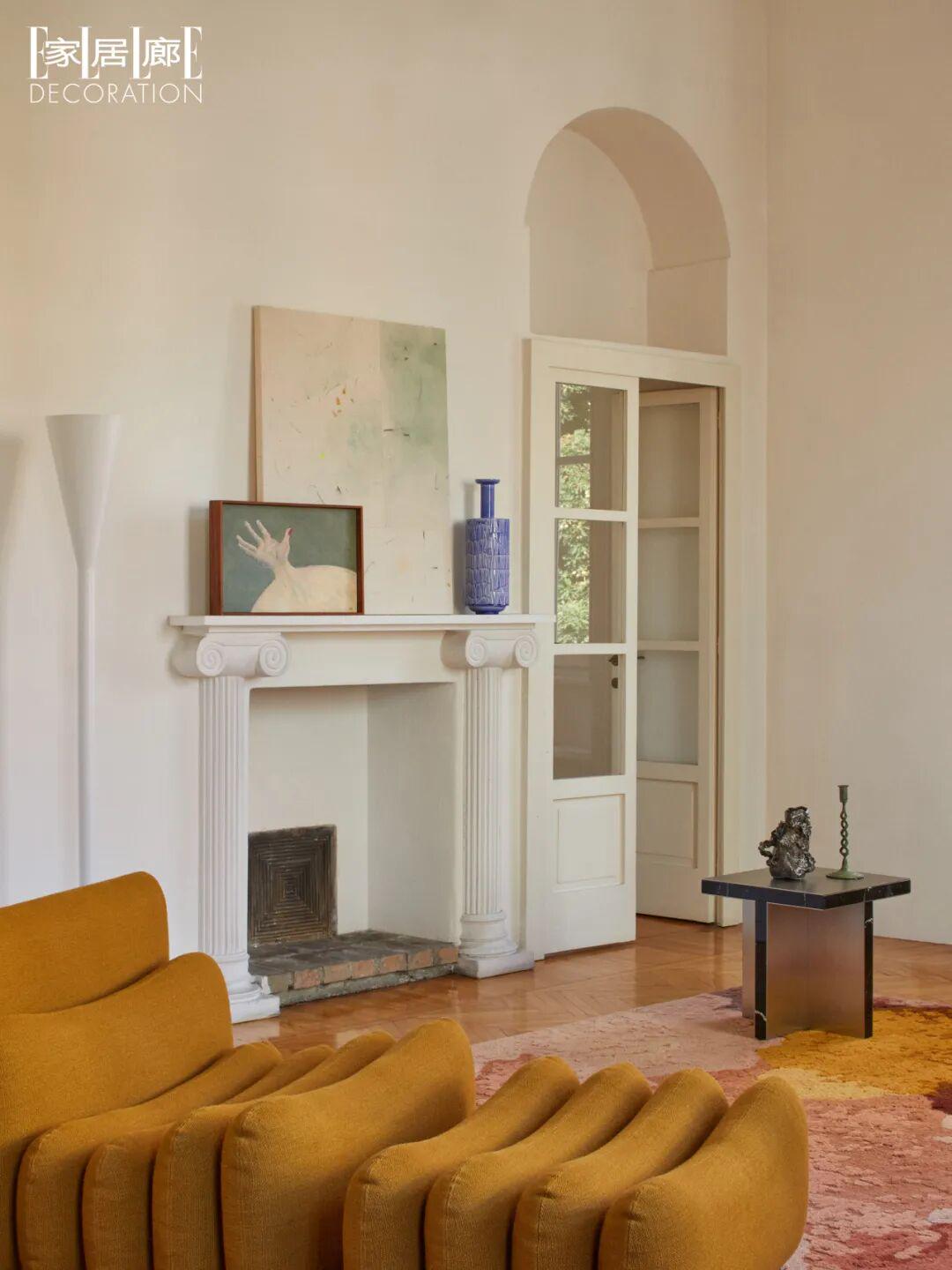 艺术品与家具摆放在一起,偶然会产生一种奇妙的化学反应,来自不同地方与时代的艺术家、设计师,他们的作品在自己的家里碰撞出新的美学视觉语言——这份私密独特的体验令思嘉着迷不已。例如,Joe Colombo的沙发设计有节奏感的起伏,与壁炉上的艺术画作《Relic 》中抽象的手指形成一种呼应,是不同时代的未来主义表现。