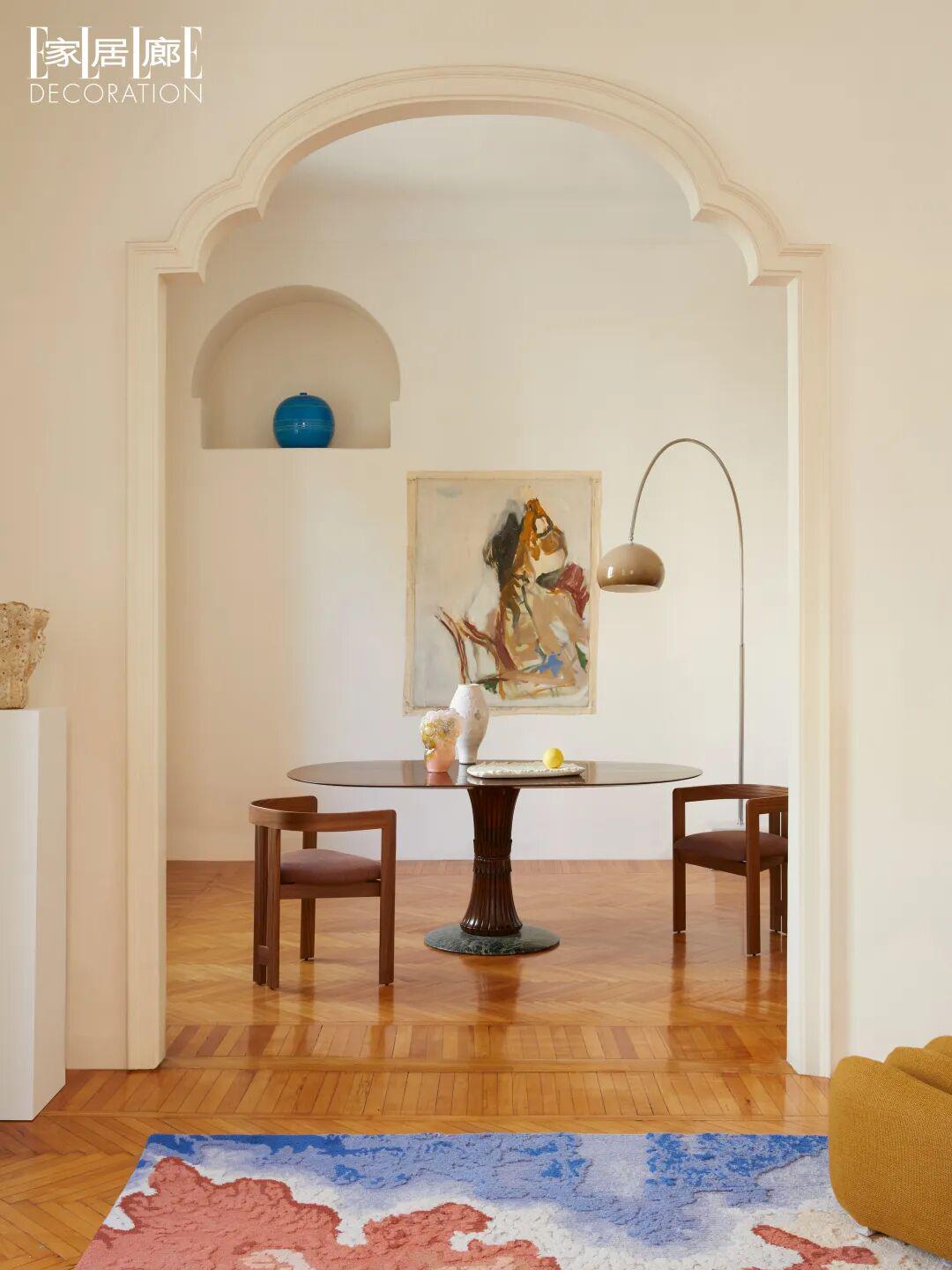 穿过客厅的门洞,来到整个公寓的灵魂区域:餐厅。门洞就像一个天然的画框,把思嘉收藏的中古桌和落地灯像艺术品一样框起来,作为“居家画廊”的主视觉,她将自己最重要的家具收藏—— 二十世纪意大利建筑大师Osvaldo Borsani设计的中古桌放置在这里, 作为工作及物品展示的空间。