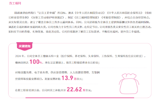 而新浪科技注意到,圆通2024可持续发展报告显示,2024年,公司全体员工缴纳五险一金(医疗保险、养老保险、失业保险、工伤保险、生育保险及住房公积金),缴纳比例达100%,并在法定基础上,按员工职级提供补充公积金。